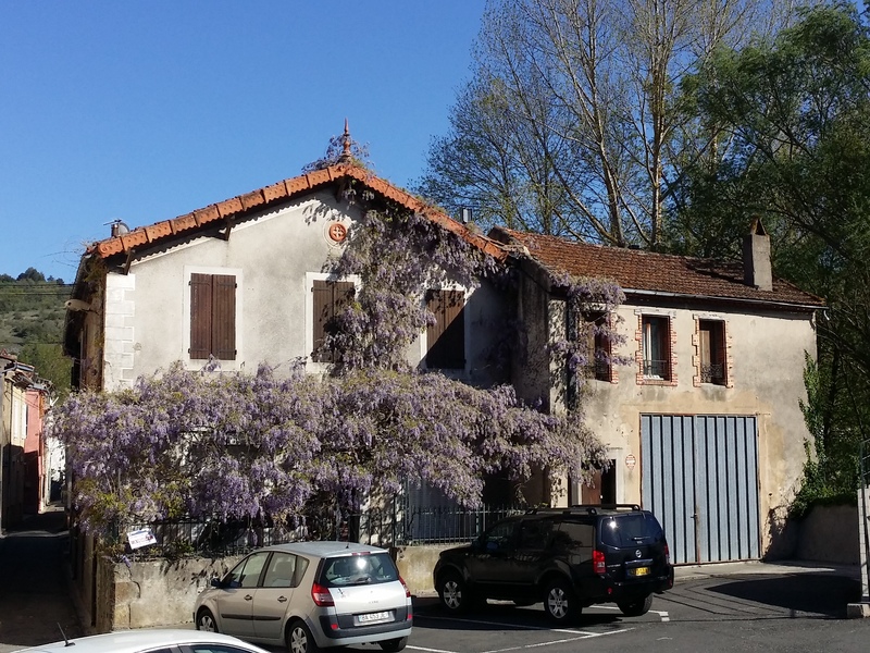 façade à la place, la glycine en fleur